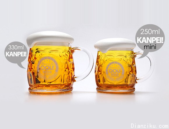 一款有意思的杯子,杯盖是整个杯子的最大亮点,饱满而膨胀的造型就像是当啤酒灌满整个杯子而溢出的泡沫,让人一眼看去就马上会感觉到一杯新鲜冰凉而且满含热情的啤酒!杯体是以传统的菠萝形啤酒杯为蓝本,却稍稍变得肥胖、可爱了。杯身上印的图样很值得玩味,外环的“Originality”字样说明了OOU!的原创精神!而底部的啤酒花双翼设计则很好地切合了啤酒杯的主题。当我们将不同的液体倒入杯子时, 液体的颜色总能与瓶身的颜色交融在一起,映出各种不同的,可能是从未见过的色彩……也许,这就是我们当时心境的色彩吧!