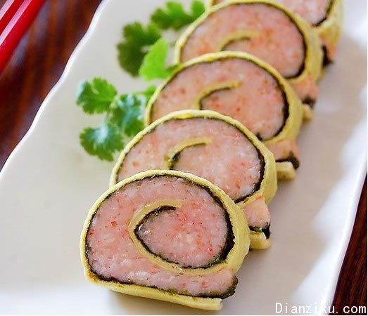 用海苔、虾仁做成的鲜虾蛋卷,不仅外形漂亮讨喜,味道也特别鲜美可口,老少皆宜,很适合作为春节家宴的头盘菜。