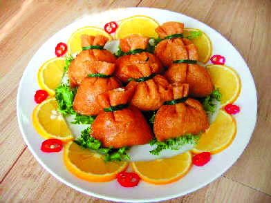 豆皮包做成的小口袋与“福”谐音,里面的主料有猪肉、香菇、胡萝卜和莲藕四样,故取名四喜福袋。除夕夜每人一个,既可爱又讨喜。